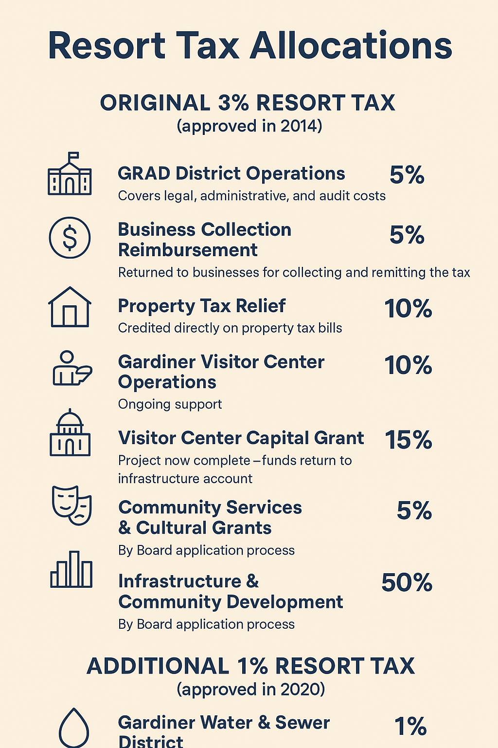 By collecting a 4% resort tax, local businesses in the resort area brought in $1.3 million from visitors and residents during the summer of 2024. Each business keeps 5% of what they collect to reimburse themselves for administering and remitting the tax. A small portion covers legal and managerial services, accounting fees, annual audits, and postage. The remainder is invested in projects that support the Gardiner community and help offset the impacts the visitors who come to our small town each year.